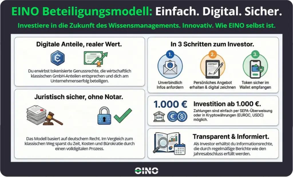Ein Beteiligungsmodell was so innovativ ist, wie EINO selbst. Wir nutzen eine moderne, rechtssichere Struktur: Tokenisierte GmbH-Anteile. Direkt von zu Hause, ohne Notar!
