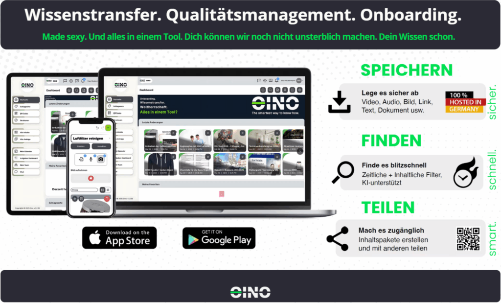 Die Ära statischer Ordner und Wissensinseln ist vorbei. Klassische Systeme sind gescheitert, weil sie Informationen fragmentieren – in E-Mails, auf lokalen Laufwerken oder, am schlimmsten, ausschließlich in den Köpfen einzelner Mitarbeiter. Verlässt eine Schlüsselperson das Unternehmen, geht ihr Wissen mit ihr. EINO bricht mit diesem Paradigma durch das Prinzip der "Single-Source-of-Truth": Eine Wissensressource wird nur einmal erstellt und aktualisiert. Ändert sich ein Prozess, ist er sofort an allen Stellen, an denen er verwendet wird, auf dem neuesten Stand – in Handbüchern, Anleitungen und per QR-Code an der Maschine. - Der entscheidende Unterschied zu KI-Copilots